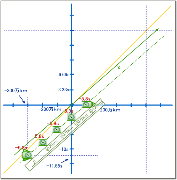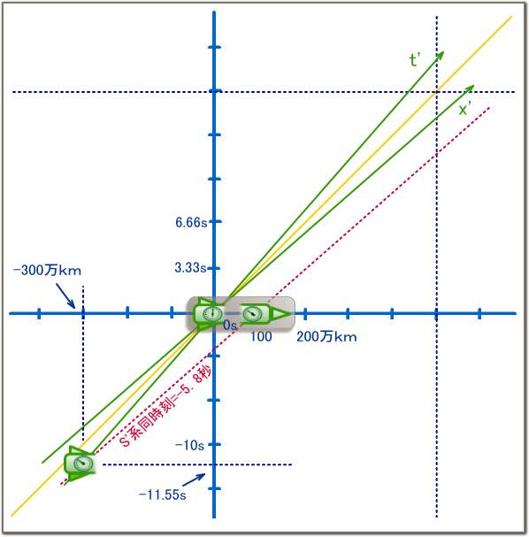 ロケット前端の時計-5.8Sに対応するS系での時空間座標は-300万km、-11.55sの点だ。 11.55s後に原点に到着する。 赤い点線で示す通り、この軌跡はS’系の時間軸t’と同じだ。