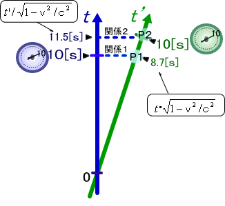 ところでS系では時間軸10秒上にP点があります。またS'系ではP点は8.7秒でした。これはP点のS’系時間軸t’上の目盛と考えてよいはずです。