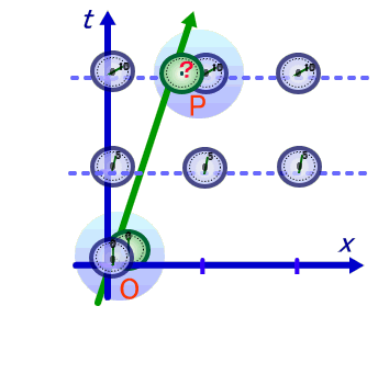 図7−7を例に取て説明しましょう。 原点Oで時刻[0秒]の移動系の時計がP点に移動したとする。この場合、Pにおける移動系の時計の時刻[?]は、静止系の時計の時刻に対しての少ない時刻を指している事になる。
