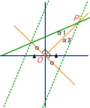 原点Oを挟んで等距離の任意の平行線に対して、原点を通る全ての直線は、マル印の様に等距離になります。よって、光の軌跡45度線OPを挟むα1,α2の角度は等しくなります。