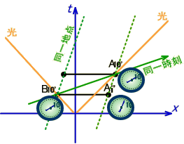 尚、この同一時刻線の軸に対する傾きは、t軸に対する同一地点線と同じ角度になります。