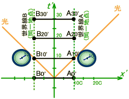 実験装置は移動系S'上で静止しているため、A点、B点それ真上に伸びた世界線となります。