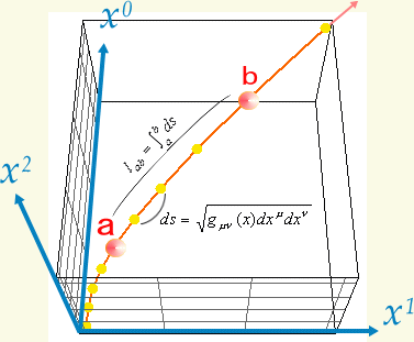 私が乗っかっている質点でのa、b間距離は、当然直線であり、最大値(ミンコフスキー時空での4次元距離は空間軸の符号がマイナスであるため、最小値ではなく最大値を取る)である。