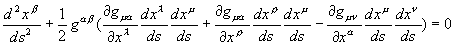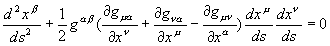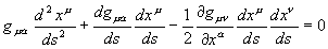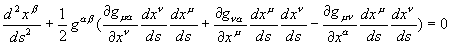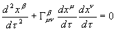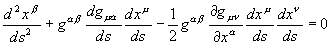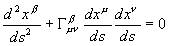 となり、以下の運動方程式を得る。これが測地線方程式と呼ばれるものであり、曲がった空間での直線の代わりになるものだ。