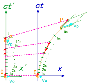 私が取り合えず測れるのは、時間軸:x0’に沿った四元距離C凾'(=C刄ム)でしかない。 質点にくくりつけた時計だからそちらから見たら、固有時間と言う事になる。