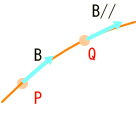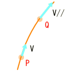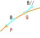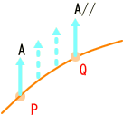 同じく、平らな空間で、ベクトルAや、Pにおける接線ベクトルBを曲線に沿って平行移動させた場合です。