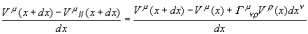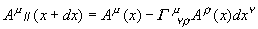 この平行移動は、Pを(x)、Qを(x+dx)とすると、測地線方程式から導かれたクリストッフェル記号を接続として用いて、
