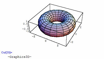 パイプをグルッとリングにして、つなげた形になる。 パイプの半径をa、リングの半径をbとすると、グラフィックの生成式は以下の通り。基本的には球面と同様にParametoricPlot3D関数で生成できる。a,bの形状を決める定数をga,gbとし今回はパイプ半径1、リング半径2としてみよう。