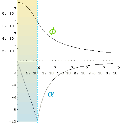 例として、地球のように球形の質量密度分布(一定と仮定)における、重力ポテンシャルφと重力加速度αの分布です。