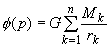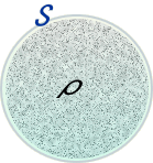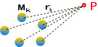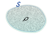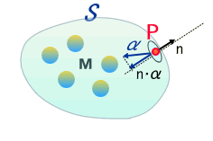 以下の様に任意の曲面Sで囲まれた領域中に、質点が複数存在し、その全質量がMである場合、