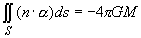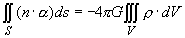 その曲面上での重力加速度の法線成分α(つまり面の外に垂直な単位ベクトルnとの内積)を、Sの全曲面にわたって積分すると