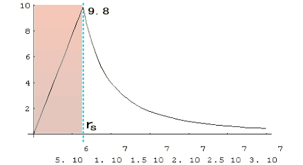 この地球の例では質量密度が均一に分布していと仮定しているため、重力加速度の大きさ|α|は、地表まで直線的に増えるわけです。