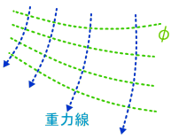 等ポテンシャル面に垂直に、重力線が走る。 等ポテンシャル面の間隔が詰んでいるほど、重力線の密度も高くなる。