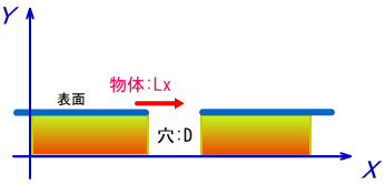 静止系に対し高速で移動している物体を考えます。その物体の移動系で測った長さをLとします。そしてその物体を静止系で測った長さをLxとします。これはローレンツ収縮した長さです。 穴は静止系にあり、静止系で測った幅をDとしましょう。