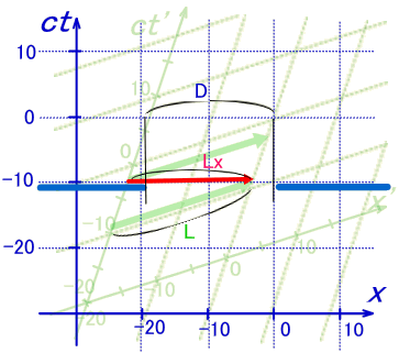 物体の移動系での長さLは20であり移動系座標-20から0に在ります。 静止系での長さLxはβ係数=1/3の例としたため、ローレンツ収縮して約19となっています。