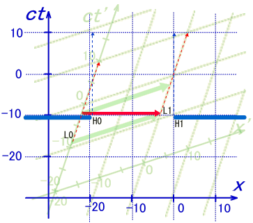 以下時空図で物体の前端(L1)はもう少しで穴の向かい側(H1)の静止系座標0に到達します。 物体の後端(L0)はまだ穴の始まり位置(H0)の座標-20に到達していません。