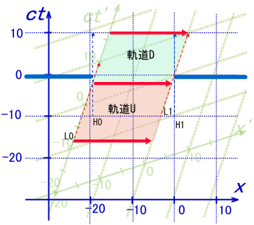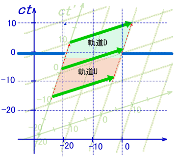 この落ちていく状況をミンコフスキー時空上に軌道Uと軌道Dで塗り分けると以下の様になります。